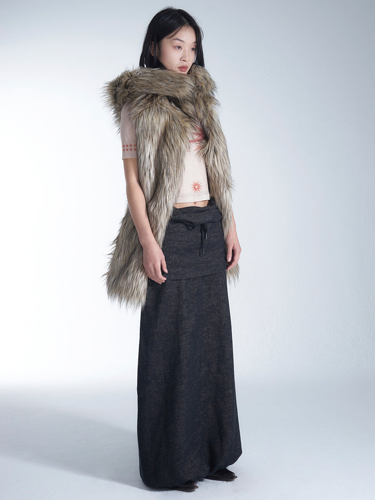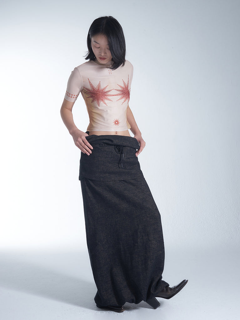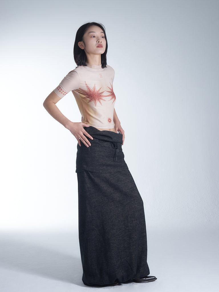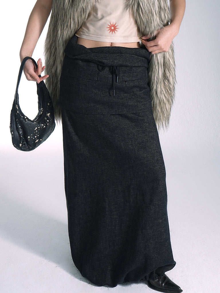 Highly recommended, this multifunctional long skirt! It features a straight cut with a slight A-line design, and the waistband creates a relaxed and breathable feel with its easy open-styled draping, while also providing a visual slimming effect on the belly. The upper part of the skirt is designed as a mini skirt with two zippered pockets, while the lower part is a tube skirt (with an elastic drawstring at the hem). The two parts are connected by snap buttons, allowing for different styling options once detached to meet various occasion needs.