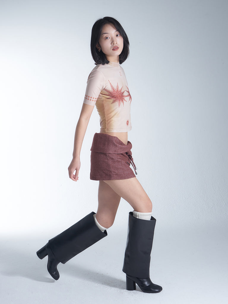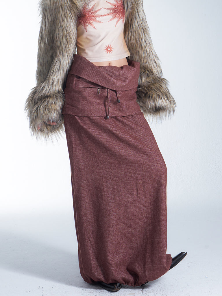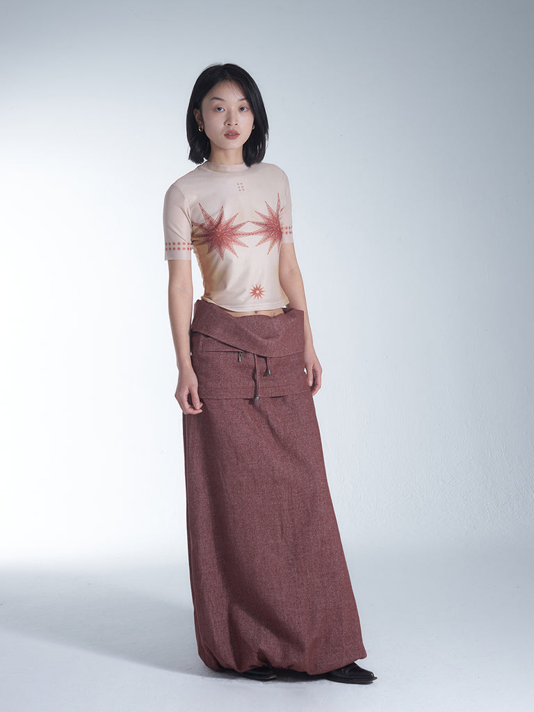Highly recommended, this multifunctional long skirt! It features a straight cut with a slight A-line design, and the waistband creates a relaxed and breathable feel with its easy open-styled draping, while also providing a visual slimming effect on the belly. The upper part of the skirt is designed as a mini skirt with two zippered pockets, while the lower part is a tube skirt (with an elastic drawstring at the hem). The two parts are connected by snap buttons, allowing for different styling options once detached to meet various occasion needs.