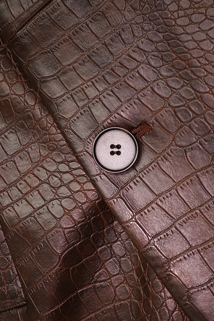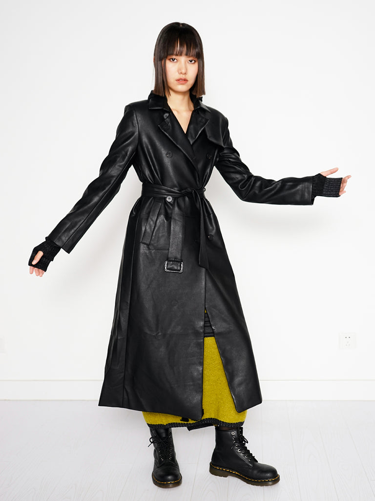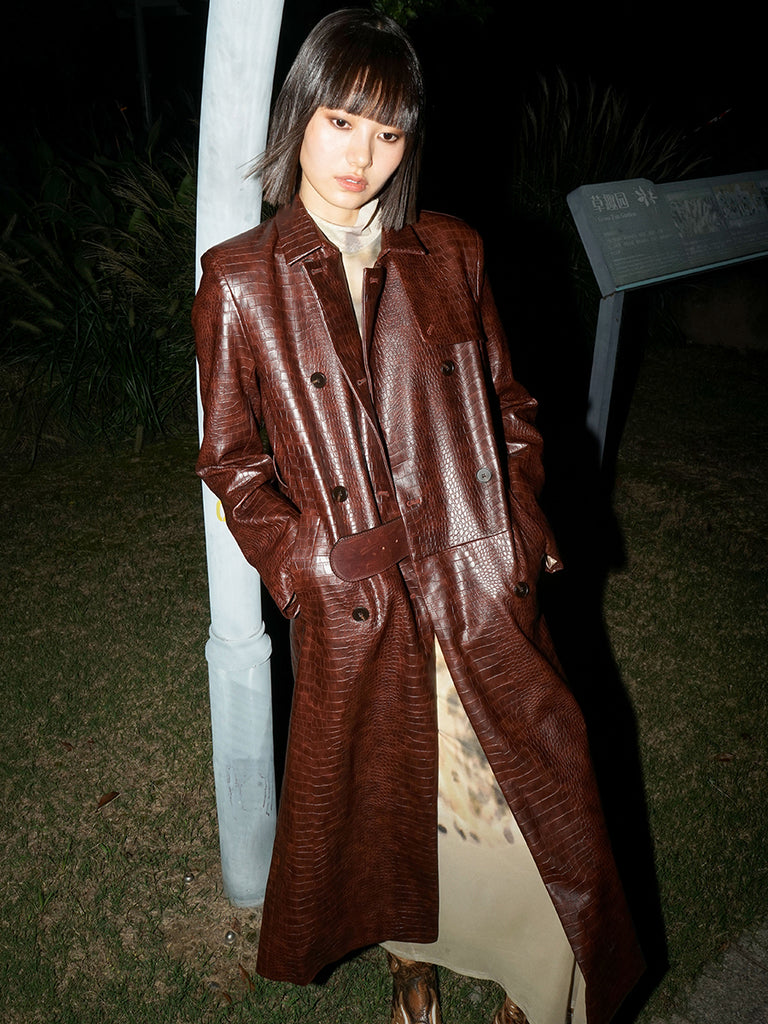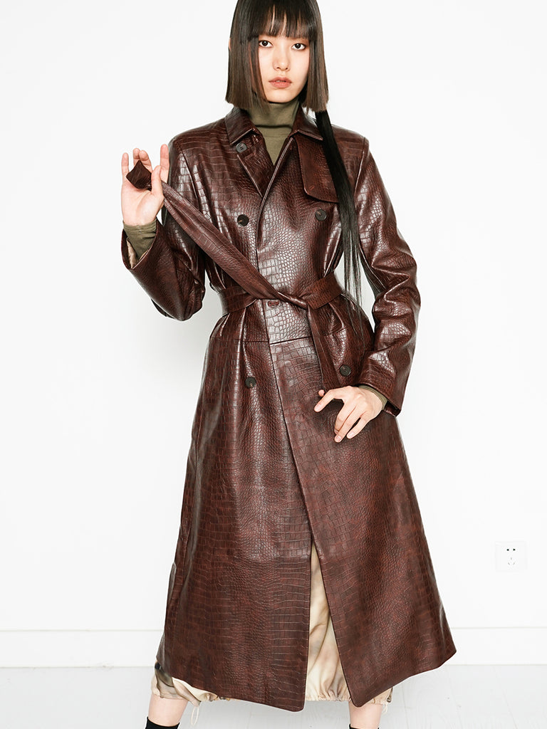 Introducing Trinity, the stylish coat that adds an air of coolness and sophistication to your wardrobe. Its imitation alligator skin fabric is eye-catching and adds luxe texture. A matching belt cinches this coat, offering wind-breaking capabilities during chilly days. Look and feel your best with Trinity!